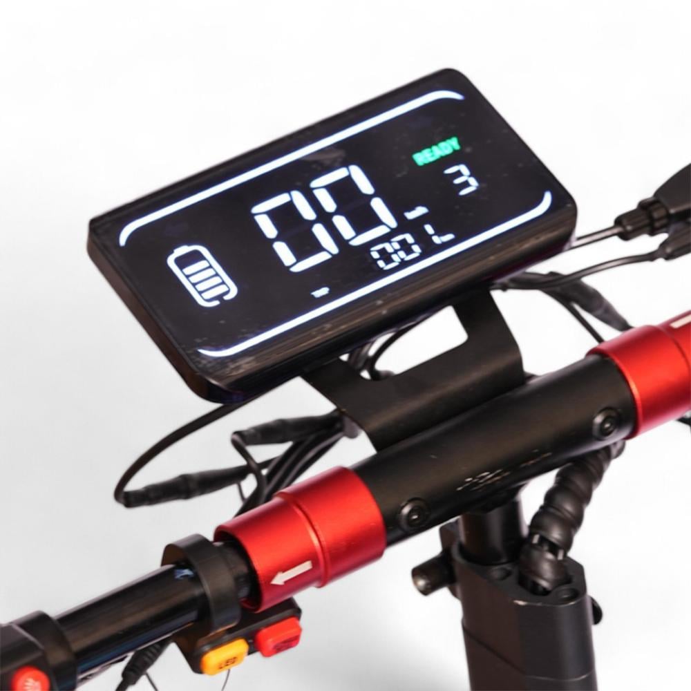 - تصميم مريح وآمن - يتميز السكوتر بمنصة عريضة مضادة للانزلاق لتوفير دعم إضافي للقدمين، بالإضافة إلى شاشة LED واضحة تعرض معلومات مهمة مثل الجهد، التروس، السرعة، مستوى البطارية، والمسافة. كما يأتي بنظام إضاءة متكامل يضم مصباحًا أماميًا، إشارات للانعطاف، ضوء فرامل خلفي، ودواسة مضيئة لزيادة الأمان والرؤية أثناء القيادة الليلية.